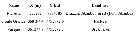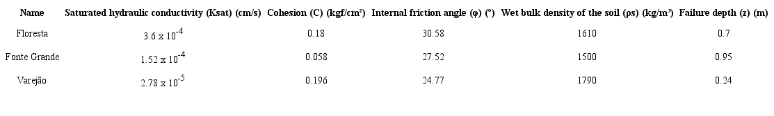 Therefore, for the SHALSTAB model, the z value was defined as the limit of the layer where an abrupt texture change occurs - 70 cm for the Floresta sample point, 95 cm for the Fonte Grande sample point and 24 cm for the Varejão sample point.