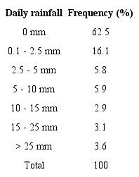 The climate normal (measured between 1961-2015) has 62.5% of its days without rainfall records in Vitoria, with a trend of decreasing frequency as the rainfall volume increases (Table 3) (EFFGEN, 2018).