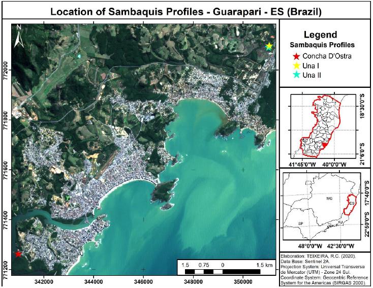 The sampling of the sambaquis considered the recommendations of Santos et al. (2015) for soils, performing the same routine for the three sambaquis. They were called Una I and Una II, located on the banks of the Una River; and Concha D’Ostra, located in the Concha D’Ostra Sustainable Development Reservation (Figure 01). The area was cleaned for each profile, then they were opened and a morphological description was used to recognize their horizons. To distinguish the horizons in each profile, we used the Brazilian Soil Classification System (EMBRAPA, 2006).