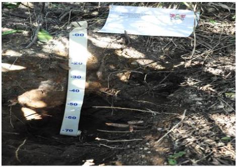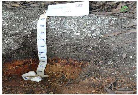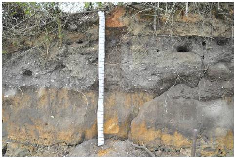 For the Sambaqui Una II, a profile was opened (Figure 03) with over 70cm of depth and five horizons: 0-15cm: horizon with very hardened, preserved shell; 15-40cm: fragmented shell in an advanced stage of decomposition; 40-55cm: transition from fragmented shell to ash; 55-70cm: very reddish material; 70cm+: very reddish material