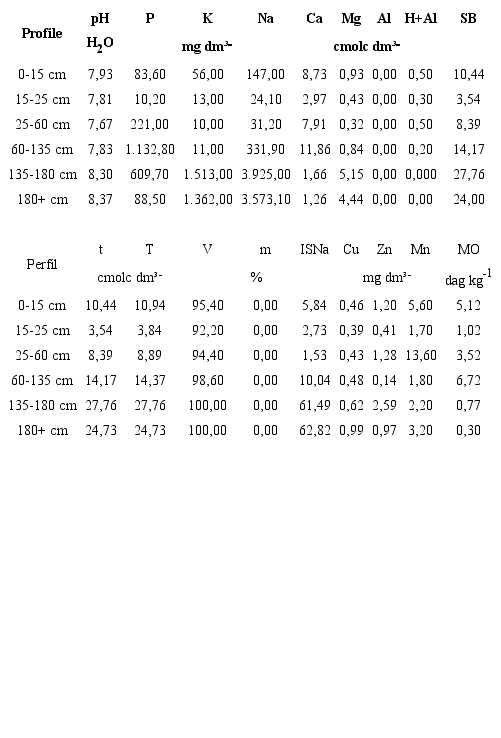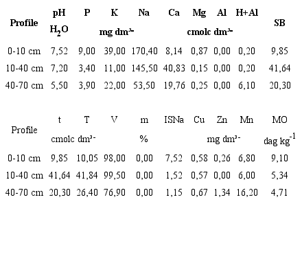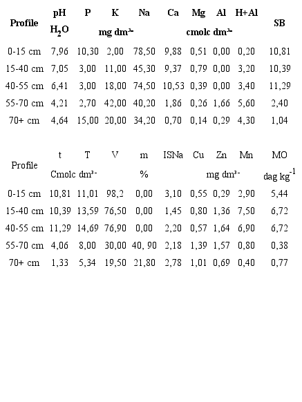 The chemical analyzes were for: determination of the hydrogen potential (pH) through of a combined electrode immersed in soil: liquid suspension (1:2,5); Cation Exchange Capacity potential (T = K + Ca + Mg + [H + Al]) and effective (t = K + Ca + Mg + Al); Sum of Bases (SB = K + Ca + Mg + [Na]); Base Saturation Percentage (V [%] = [SB x 100] / T); Percentage of Aluminum Saturation (m [%] = [100 x Al³] / t); the Sodium Saturation Index (ISNa [%] = 100 x Na + / T); Al3 +; H + Al; macronutrients (P, Ca, Mg and K) and micronutrients (Cu, Zn and Mn); and soil organic matter (OM).