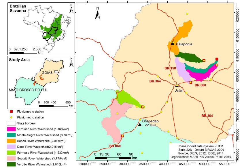Taking into account the diversity of landscapes in the examined region, seven watersheds or parts of watersheds were selected in locations with similar climatic characteristics (Figure 1). They were: a) the Formoso River watershed, with an area of 1,532 km², located in the southwestern end of the state of Goiás and with over 40% of its territory turned into Emas National Park; b) the upper course of the Sucuriú River watershed, with an area of 3,775 km², located in the northeast region of the state of Mato Grosso do Sul, showing a variety of agricultural uses; c) the upper and middle courses of the Doce (2,015 km²), Monte Alegre (809 km²), Verdão (1,015 km²), and Verdinho (1,668 km²) rivers, between the municipalities of Jataí, Rio Verde, and Montividiu, in the southwest region of the state of Goiás, also having a considerable diversity of agricultural uses, including sugar cane cultivation and center-pivot-based irrigation, in addition to reduced areas with remaining natural vegetation; and d) the Bonito River watershed, with an area of 2,015 km², located in the municipalities of Caiapônia, Palestina de Goiás, and Arenópolis, in a region where the agricultural frontier of the state of Goiás is currently being expanded.