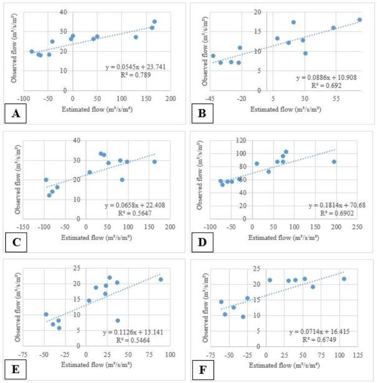 Although more tests must be carried out, it is possible to note, based on the regression equation, that the estimated values will probably follow the same patterns as the observed values, which confirms the validity of the application of the algorithm in watersheds that do not have flow monitoring stations.