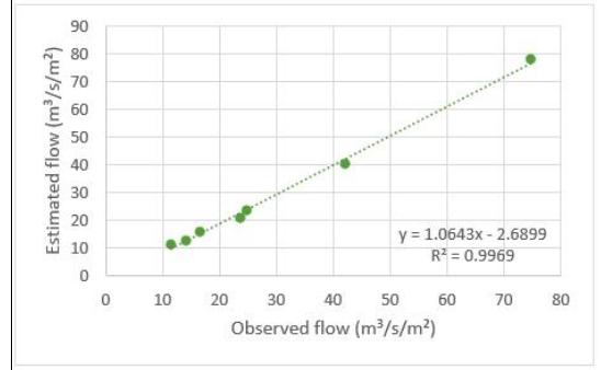 The mean squared error (MSE) and its root were calculated after analysis of the correlation between the variables. These parameters are important indicators of agreement between variables (WILLMOTT et al., 1985). The lower the MSE, the higher the agreement. An MSE of -0.5898 m³/s/m² was identified between observed and estimated flows, indicating an underestimation of the method. In an ideal situation, the MSE should be close to 0 (OLIVEIRA, 2016).