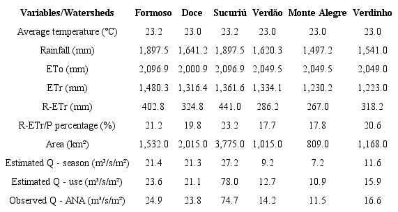 As shown in Table 1, the flows estimated by using simplified water balance (R - ETr) were approximately 20% of the rainfall volume over the 2018/2019 hydrologic year, adopted as a standard year for showing values close to the average rainfall records in the region. In the Formoso and Sucuriú River watersheds, the rainfall was slightly higher than the average for the region because of the high values recorded in November 2018.