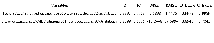 When summed, the values of flow per second per area of each land use and land cover category express the watershed flow over one hydrologic year, which began on 10/01/2018 and ended on 09/30/2019 in the present study. The results were compared with the data collected at ANA fluviometric stations for checking purposes and submitted to statistical analysis.