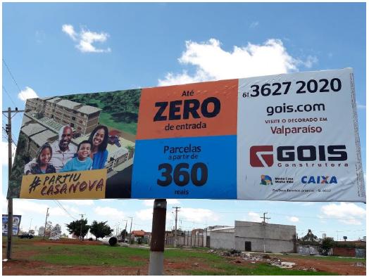 Figure 2 shows a billboard of a housing production company that focuses its operations on the municipalities around the Federal District. The figure shows the prominence of the Caixa Econômica Federal as a financing agent through resources provided by the PMCMV, which is also featured in the announcement. In addition, it is worth mentioning that the billboard is located by the federal highway BR-040, in the territory of the Federal District. The announcement concerns housing units in Valparaíso de Goiás, but it was set up within the Administrative Region of Santa Maria/DF.