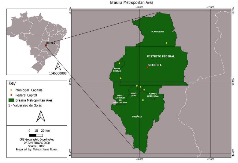For this study, the Brasília Metropolitan Area was considered as an urban grouping that has Brasília as its center and encompasses the entire quadrilateral of the Federal District. In addition to the Federal District, the BMA also includes municipalities in Goiás that had their occupation, consolidation and urban expansion related to the socio-spatial dynamics of the federal capital. We chose to analyze the BMA as being composed of the Goiás municipalities of Águas Lindas, Cidade Ocidental, Luziânia, Novo Gama, Planaltina, Santo Antônio do Descoberto and Valparaíso de Goiás, represented in Figure 3: