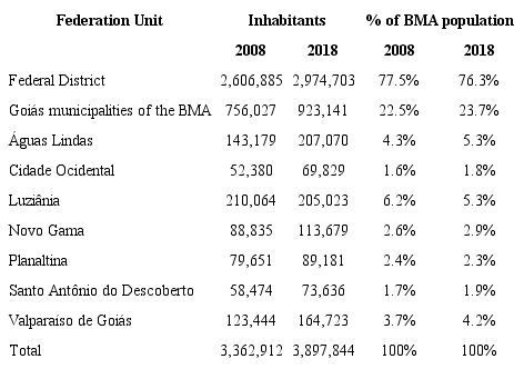 Table 1 shows the BMA population estimate, where the variation in the estimate is observed between the years 2008 (before the PMCMV) and 2018. Most of the inhabitants live in the territory of the Federal District, and that the Federal District has lost a percentage share in relation to the Goiás municipalities of the BMA in the studied period: