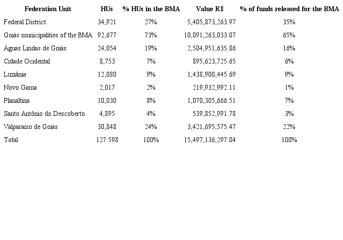 The Goiás municipalities of the BMA received most of the financial resources released by the PMCMV, despite the discrepancy in the housing contingent between the Federal District and these municipalities, which corroborates the thesis of peripheralization for the municipalities of the Goiás Entorno. Other information verified included the number of housing units produced per municipality and the corresponding percentage of these units in relation to the production financed with funds from the program in the BMA according to Table 2: