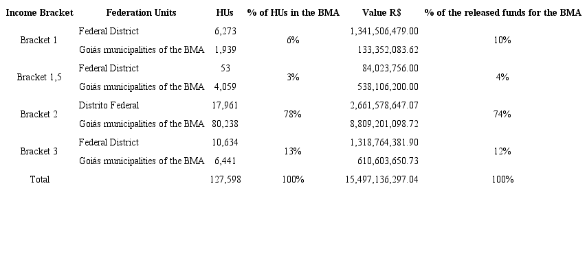 Considering the distribution of the housing units and the financial resources according to the income bracket established by the federal government program, Table 3, which highlights this relationship, was prepared:
