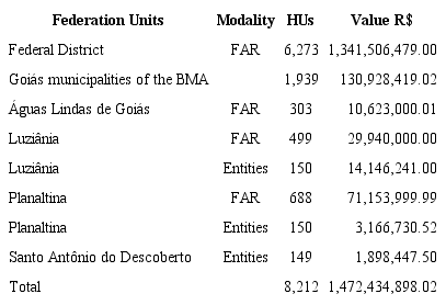 The FAR modality was the only one directed towards Bracket 1 that materialized in the Federal District, with no Housing Unit concluded with resources from the "Entities" modality in Brasilia. In the Goiás municipalities of the BMA, only four HUs were produced for Bracket 1, with an emphasis on the absence of Cidade Ocidental, Novo Gama and Valparaíso de Goiás, which did not receive any units for this bracket of the program.