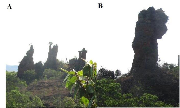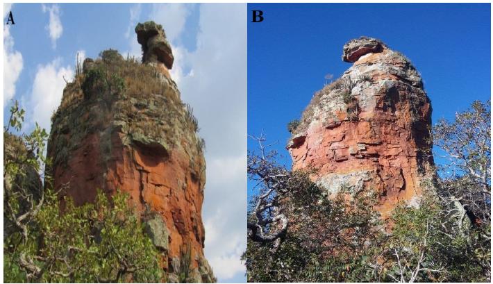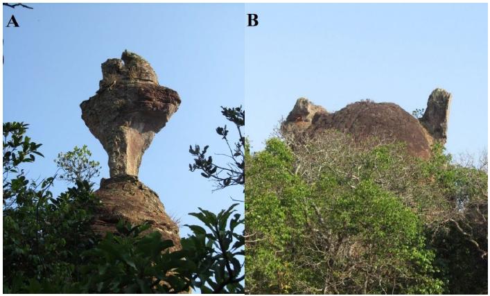 The geoforms Cérebro (Figure 9A) and Lagartixa (Figure 9B) are similarly shaped especially for being cylindrical. From a specific point at the top of the geoforms down to their bases, both monuments suffered similar erosive processes. However, the top of both geoforms suffered a more intense weathering resulting in smaller and thinner sandstone structures.