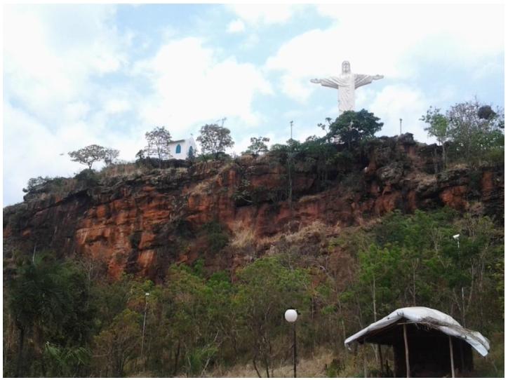 The stone wall Cristo Paredão is located in the urban area of Paraúna and belongs to the Botucatu Formation. This uniform relief (Figure 2) is an important and easily accessible tourist attraction that is regularly visited. The height of Cristo Paredão is approximately 100 meters. Standing out for its aesthetic value, this large stone wall is significant to the scenery of Paraúna city. In its vicinity, there isthe City Hall, the Public Forum, and the main administrative buildings of Paraúna. The residents of Paraúna consider Cristo Paredão the postcard scenery of the city. It also has a cultural value for being a spot where the local population attends religious manifestations in the chapel located at the top of the relief. According to residents, the chapel was built in 1950 as retribution to the grace received by Mrs. Otavila de Souza Melo. In this chapel, the traditional Novena Masses to Nossa Senhora da Guia are celebrated.