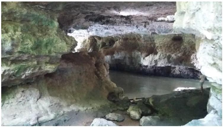Ponte de Pedra (Figure 3) is approximately 60 km from Paraúna and is part of the Adamantina Formation. The river runs through large cliffs surrounded by dense vegetation and drains into a rectangular passage, in free fall, forming a small waterfall at the entrance of a cave located under the relief. The waterfall is used for leisure by visitors, has easy access and adequate infrastructure. According to the Tourism Inventory of Paraúna (2007), the geological unity is formed by calcareous rocks that reach 100 meters long. However, the description of Goiás (2008) classifies the rocks of the Adamantina Formation as massive, light grey, beige or pinkish sandstones that are fine to very fine-grained (sometimes medium-grained), mostly poorly sorted and show subordinate plane-parallel cross-stratification. These sandstones likely have a calcareous matrix, which explains the formation of the cave.