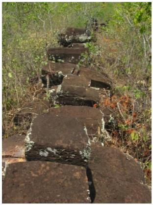 The geological formation Muralha de Ferro (Figure 7) is approximately 34 km from Paraúna. It is composed by a large stone wall forming a stairway with naturally cut and lapidated organized rocks. The stairway is an important element in the attribution of aesthetic value. According to the Tourism Inventory of Paraúna (2013), Muralha de Ferro is formed by black basaltic rocks, a type of resistant volcanic rock also known as iron-rock (magnetite), that is 1 meter wide, reaching up to 2 meters in height in some areas. To Casseti (1990, p 74) there are diabase dykes of considerable length on which the resulting topographic relief characterizes the popularly known ‘wall’ that was formed by differential erosion. Therefore, this explains the name Muralha de Ferro (Iron Wall). This geological unity is associated with Serra da Portaria that is also characterized by dykes that cut the sandstone and resemble portals.