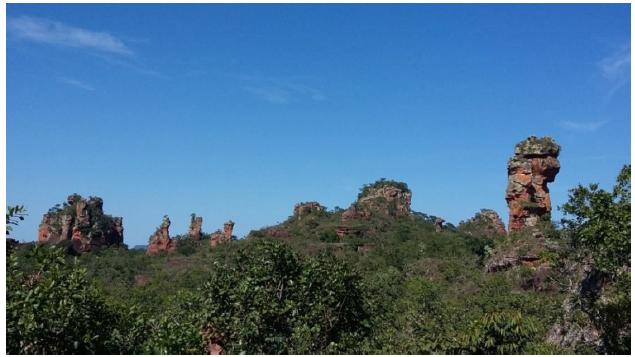 The Aquidauana Formation is considered Permo-Carboniferous in age (RADAM BRASIL, 1982). According to Goiás (2008), this unity is located in Southwestern Goiás State and is 300 km in length according E-W and 65 km in width from nearby Paraúna to Mato Grosso State. This unit is composed of conglomerates of quartz and sandstone pebbles. Most rocks are reddish-purple and comprise medium to thick sandstone beds that are friable with some feldspar inclusions, and show trough cross-stratification. There are also local silicified levels with white thick sandstones as well as conglomerates (diamictites) followed by finely layered siltstones and argillites, and red to grayish-green shales. Rhythms formed by thin levels of argillite, siltite, and fine sandstone are also observed in this unity (GOIÁS, 2008). The Aquiduana Formation is located at northwestern Paraúna and is one of the most representative units in areal terms. The main Geodiversity sites are located in the residuals with steep edges and rugged areas produced by erosion. Considering the geomorphological aspect, these features present shapes of animals and objects.