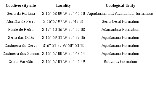 Geodiversity sites at Parque Estadual de Paraúna are important areas to preserve local geodiversity. Here we identified seven Geodiversity sites based in Brilha (2016) and adapted from Borba et al. (2013). Box 1 shows the name, locality and geological unity of Paraúna’s Geodiversity sites.