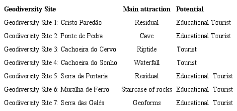 After applying the methodological procedures and performing the inventory methodology of Brilha (2016) for Geodiversity sites, seven sites were selected. Their geoform, which constitutes the main attraction for the category of the site, are highlighted in Table 2. Regarding the main attraction of the inventoried sites, the geoforms (goblet, turtle, anvil, brain, stone soldier, indian woman) stone sidewalk, residuals, and waterfalls stand out.