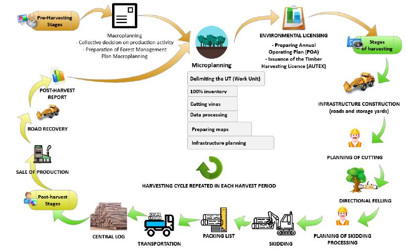 Regardless of the model adopted, sustainable forest management in UCs for timber processing must be implemented through drawing up a PMFS, regulated by Normative Instruction no.16, of 4 August 2011 (BRASIL, 2011), and following Reduced Impact Harvesting (EIR) techniques, which must be implemented in a manner integrated with silvicultural practices and sensitive to the need for growth and regeneration of the remaining trees. Those measures reduce the environmental damages caused during felling and increase the efficiency of the action and the financial return (SHULZE, GROGAN, VIDAL, 2008, p. 175) (Figure 3).