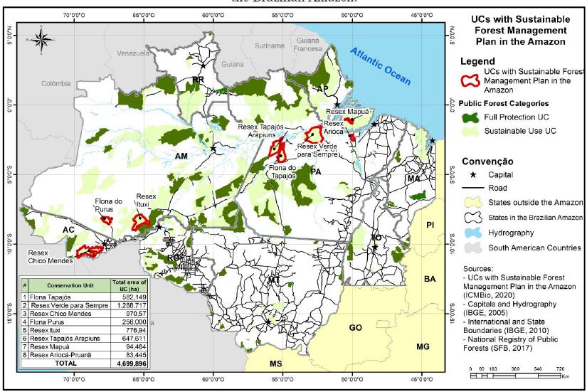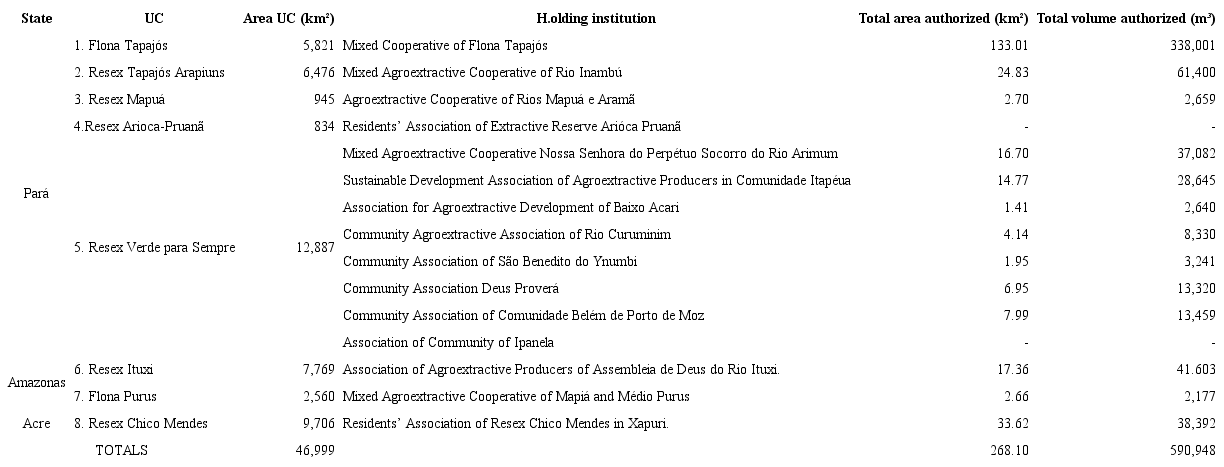 Thus, approximately 242,556 thousand km2 of areas in sustainable use UCs in the Amazon would be eligible for community forest production. The remainder, about 276.996 thousand km2, would be designated for management by businesses (Table 2).