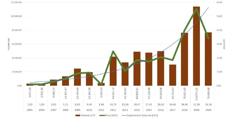 Figure 5 presents the history of the annual supply of logwood coming from the PMFSs in the eight UCs over the last 15 years. The first management plan for a UC was approved in 2005 in the Flona Tapajós, making an area of 1 km² available for that year and a volume of approximately 3 thousand m³ of managed logwood. For 2019 and 2020, the area approved for authorized forest management in sustainable use UCs in the Amazon totals 89.46 km² and an approximate volume of 190,782.12 m³ of managed logwood (ICMBio, 2020).