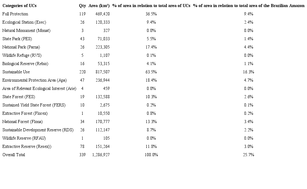 As of December 2018, there were 339 UCs in the Brazilian Amazon, totalling 1,286,927 km², which corresponds to 25.7% of that territory. Of that total, 220 are in the Sustainable Use category - where the objective is to harmonize nature conservation with sustainable use of common goods for generating income, balancing human presence in protected areas; and 119 are in the Full Protection category - where the primary objective is to maintain ecosystems without the changes caused by human interference, allowing only indirect use of their natural attributes (Table 1).