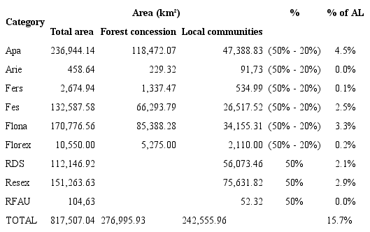 To calculate projections of the potential of areas for MFCF in UCs we will consider the models for designating public forests, and the norms provided in the forest code for protecting native vegetation in permanent preservation areas, legal reserve, restricted use and timber harvesting. From that, as shown in table 2, the following percentages will be adopted for the areas available or qualified for forest production: (i) 50% of the areaof UCs in the Resex, RDS and Refau categories, directed towards community production; (ii) in the other categories of UCs, where onerous concessions for companies are allowed, the division will be 20% for community use and 50% for business use.