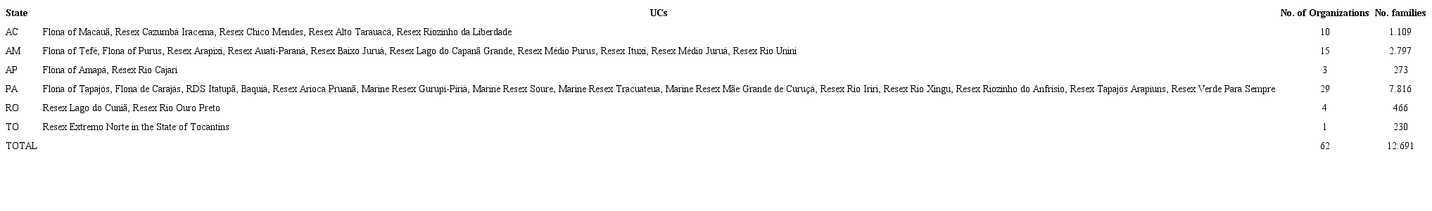 Those initiatives are in eight UCs in the states of Pará, Amazonas and Acre, which together total 46,999 km², around 6% of the total area of sustainable use UCs in the Amazon (Figure 4).