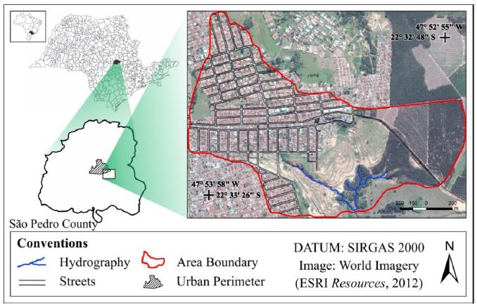 This study was conducted in the Tucum stream upper basin. It is located in the city of São Pedro, in the central region of the State of São Paulo, Brazil (Figure 1). The area has erosive features occurring on the periphery of the municipality's urban grid.