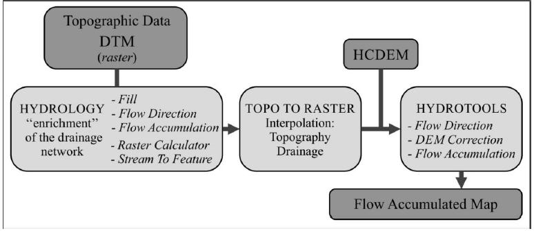 We can summarize the operational sequence adopted in the following steps: a) Fill - filling in the gaps from the design of the digital model; b) Flow Direction - elaboration of a model containing the surface runoff flow directions; c) Flow Accumulation - mapping of the possible concentration channels for the flow of the runoff, based on a multidirectional algorithm (which considers the accumulated flow value in each cell of the model, depending on the preceding cells upstream). We completed the procedure using the Raster Calculator command, from which a file containing the drainage network layout is generated and, using the Stream to Feature command, converted into a shapefile format.