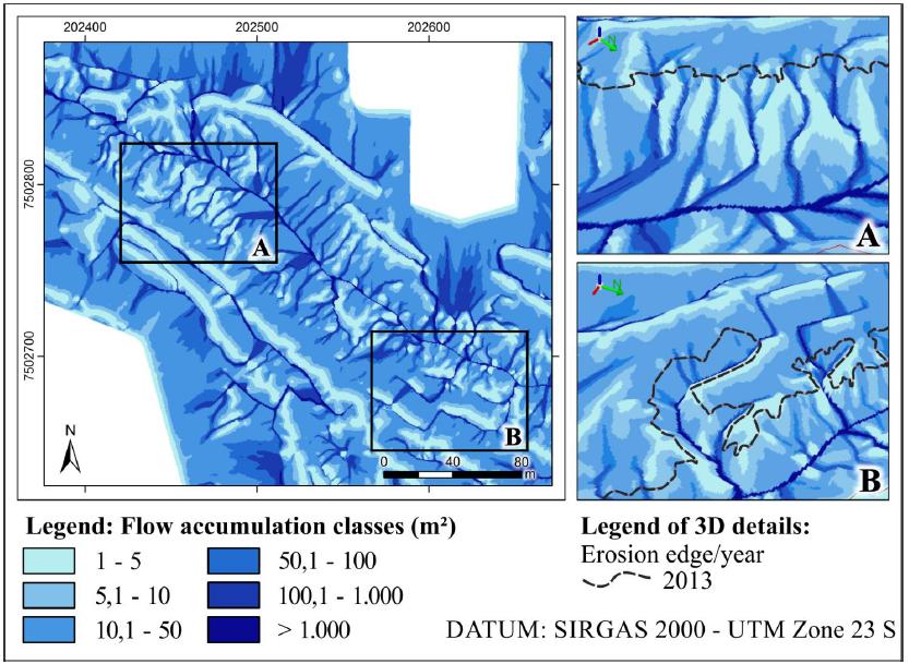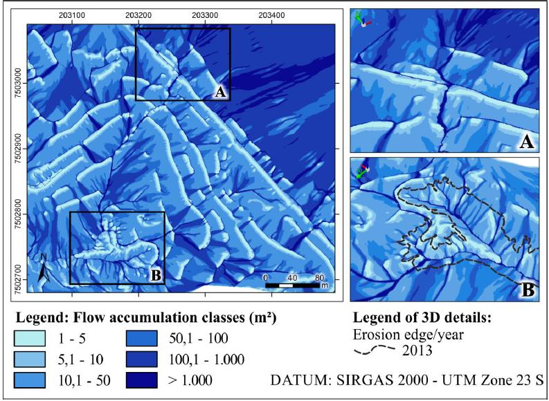 After the generation of the Accumulated Flow Map, a three-dimensional model was elaborated using the ArcScene 10.1 program, from the overlay of the map in raster extension to the MDE. A vector drawing of a line representing the edge of the erosive slope was also inserted. These procedures were carried out to assist the process of analyzing cartographic products, as well as for the composition of the images that illustrate this article.