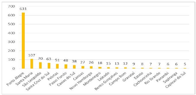 Bringing together the 20 largest municipalities that shelter IT companies, they account for 82% of the companies. Porto Alegre presents itself as a prime city, it is the most important within the IT activities, bringing together half of IT companies, since 2016, Porto Alegre had 3,759 companies, containing 46.6% of the companies of the entire state. Figure 1 also reveals the importance of metropolitan region (MR), counting the municipalities that have the largest number of IT companies, in which ten of them are in the MR of Porto Alegre: Novo Hamburgo (397), Canoas (331), São Leopoldo (282), Gravataí (134), Cachoeirinha (121), Esteio (69), Montenegro (64), Campo Bom (59), Sapiranga (56) and Guaíba (49). In addition to the capital and MR, the other municipalities in Rio Grande do Sul that have IT activities highlighted already have recognized economic and political evidence, as in the cases of Caxias do Sul (420), Pelotas (204), Santa Maria (142), Passo Fundo (135) and Santa Cruz (111).