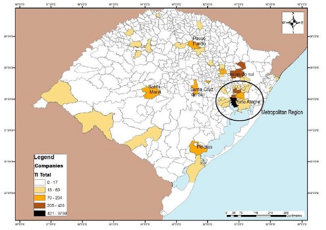 Analyzing Figure 1, which presents data of the location of IT companies in the territory of Rio Grande do Sul, there is an agglomeration of companies in the Porto Alegre-Caxias do Sul axis, and this axis also covers the Metropolitan Region of Porto Alegre.