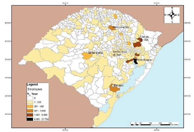 As a result of Figure 1 and 2, there is a concentration of IT activities in the MR of Porto Alegre, expanding a little more on the Caxias do Sul-Porto Alegre axis. And the municipalities that stand out outside the axis are: Pelotas, in South; Santa Maria, in the Center; and Passo Fundo, in North, both in relation to companies and the number of employees. However, without a doubt, Porto Alegre is the great center that embraces this activity, reinforcing what has already been stated, the cities are the ones that provide the conditions for this to be possible, especially those that can guarantee synergy coming from those who want to innovate and who needs innovations.