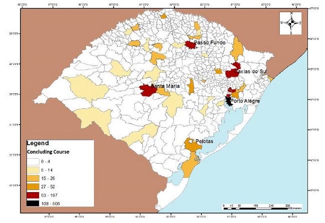 Figure 4 helps in assessing the spatialization of data from the Higher Education Census. It is observed that the largest number of graduates is located in the municipalities that have more IT companies, and Porto Alegre is again highlighted, followed by Caxias do Sul and Novo Hamburgo. The 10 municipalities that sheltered, in 2016, the 1,204 graduates in Undergraduate courses in IT are equivalent to 74% of graduates in the area. Computer Program records are data referring to deposits at the INPI, of people or companies, to protect the authorship of the invention. For the use of this work, data from 2000-2016 were aggregated, and the data are still timid, which denotes little innovation in this segment of the services sector.