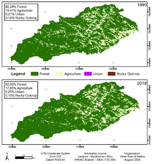 The land use and cover maps (figure 4) demonstrate the reduction of the area dedicated to agriculture, the growth of forest cover and the expansion of the urban area. If in 1990, the year in which REMC was created, there was 80% forest cover, in 2018 this value grew to 82%, corresponding to a growth of 600 hectares. This fact is attributed to the combined result of years of inspection, the delimitation of arable land by the management plan, based on satellite images from 2010, where the areas covered by forests started to be dedicated to preservation, the abandonment of the practice of fallow and the adoption of modern agriculture techniques, such as the use of pesticides and chemical fertilization, and mainly by the acquisition of land by smallholders, who allow the recolonization of the forest cover (figure 5) due to their lack of interest in agriculture.