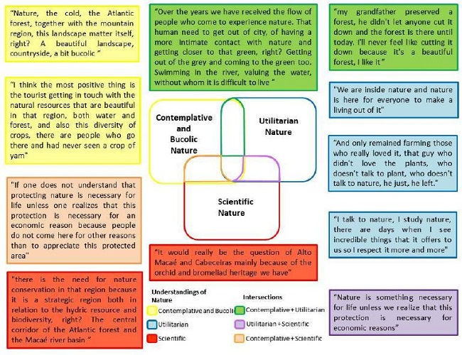 Finally, during the interviews, three main understandings about nature were identified among the social actors. Contemplative and Bucolic Nature: nature perceived through its scenic beauty, its transcendental and bucolic aspect and, therefore, as a motivating/ attractive element of tourism; a nature that is outside the subject, “external” to their daily live, a nature that must be essentially preserved; Utilitarian Nature: intrinsically associated with everyday life, that is, understood as part of the wheels of life, with which the subject is directly related. This understanding was popular mostly among farmers. According to it, the protection of nature is necessary and its use does not require a daily relationship; Scientific Nature: merges with the idea of a mere bank of natural resources, that is, a scientific nature, also perceived as a means for strategic conservation and maintenance of ecosystem services (figure 6). Despite the systematization effort, it cannot be overlooked that some meanings of nature mix aspects of two or more mapped understandings, and are therefore not exclusive.