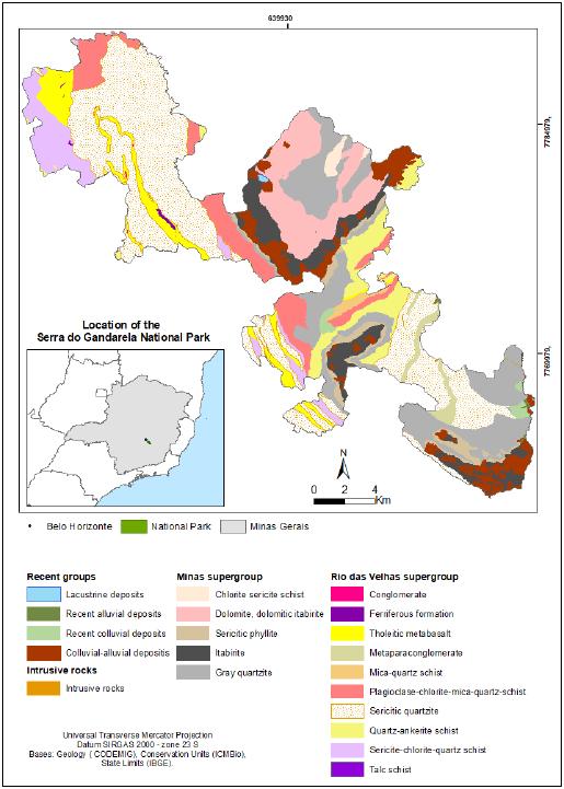 This conservation unit is inserted within the Quadrilátero Ferrífero (QF), where outcrops of Precambrian lithostratigraphic units of the Rio das Velhas and Minas supergroups can be found. At a lesser scale, there are also lacustrine deposits, lateritic-detrital coverings, colluvial deposits, and colluvial-eluvial deposits, of Cenozoic age, as well as alluvial deposits composed of Phanerozoic rocks (Figure 1).