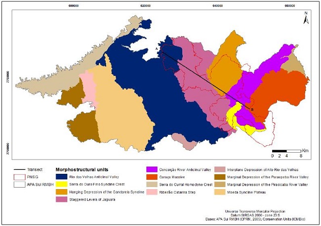 Different lithological types, with multiple degrees of resistance to chemical weathering and erosion, combined with complex structural conditioning, marked by folding and thrust faults, as well as Cenozoic tectonic uplift and bioclimatic factors, conditioned the modelling of the morphostructural compartments found in the QF, at their origin and during their evolution (MEDINA; DANTAS; SAADI, 2005). Among the morphostructural units proposed by these authors for the QF, six were identified in the study area: the Rio das Velhas Anticlinal Valley, Staggered Levels of the Serra do Jaguara, the Depressão Suspensa of Gandarela Syncline, the Conceição River Anticlinal Valley, the Serra do Ouro Fino Syncline Crest, and the Caraça Massive