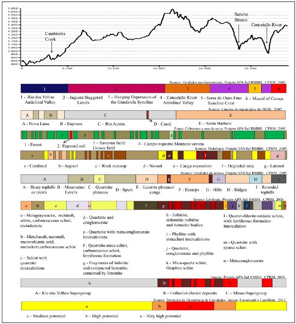 The geoecological profile represents the landscape characteristics in the form of a transect. Abiotic elements (soils, relief units, morphostructural units, lithology, and the potential for the occurrence of caves) and biotic elements (use of soil and vegetal coverage) were used to elaborate the geoecological profile of the Serra do Gandarela National Park.