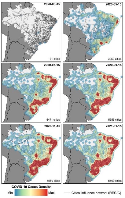 The spread of the virus followed an urban hierarchy, as it first reached São Paulo and Rio de Janeiro, considered the main metropolises in the country. Subsequently, COVID-19 accelerated in the capitals, medium and small cities. Figure 1 presents a temporal evolution overview of COVID-19 incidence in the Brazilian territory.
