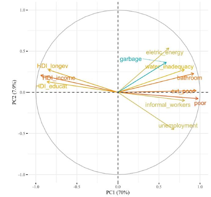 The indicators, selected to describe municipalities according to basic household infrastructure and to income/employment conditions, were normalized and rescheduled for dimensionality-reduction through Principal Components Analysis (PCA). PCA is a multivariate technique that analyzes a data table representing observations described by several dependent variables, which are, in general, inter-correlated (ABDI; WILLIAMS, 2010). Its goal is to extract the important information from the data and to express this information as a set of new variables called principal components. One of the advantages of PCA is that it has no normality assumption. Using PCA, it was possible to compress 70% of the variance of the 12 indicators in the first component (Figure 2). Therefore, PC1 was used as a socioeconomic index for further analyses and comparison with data on the evolution of the epidemic in Brazil.