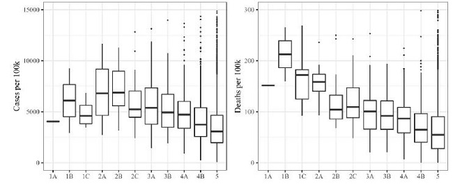 Regarding data from the Regiões de Influência das Cidades - REGIC (REGIC, 2018), category 1A (São Paulo) is characterized as being the great national metropolis, and 1B (Rio de Janeiro), for national metropolises. In Figure 4, both classes have medians that indicate worse conditions for the number of cases and deaths by COVID-19. Category 1C is classified as a metropolis, and comprises a set of 12 cities spread across the five Brazilian regions. These cities are characterized by a high number of cases and deaths. The diversity of values in both cases and deaths is explained by the different regional situations that characterize urban centers belonging to category 1C, especially the urban centers’ diversity of intermediate hierarchy, which act both in the daily role of attracting flows (agglomeration factor) and, therefore, contagion, as well as in the effort to provide medical care to those contaminated.