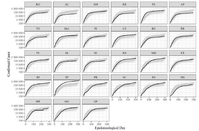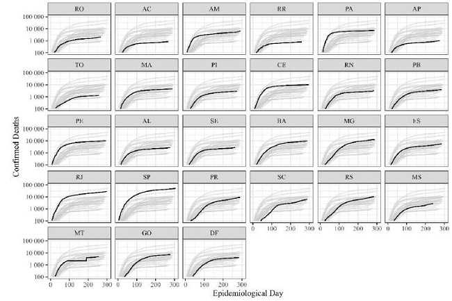 Regarding the confirmed cases of COVID-19 (Figure 5), starting from the date of the 100th notified case, the state of São Paulo (SP) has demonstrated an increasing curve in the number of notified cases and deaths, with slight fluctuations of 150 days in the data series. Subsequently, the number of notifications displayed a slight fluctuation of 50 days, once again indicating growth between the final 200 and 300 days of the series. The state of Rio de Janeiro (RJ) revealed a similar pattern of growth in the first 100 days, where small fluctuations were found between days 100 and 250 of the monitoring. The vast majority of states revealed increasing curves, with the exception of the states of Paraná (PR) between the first 50 to 100 days; Mato Grosso do Sul (MS), where in the first 100 days the growth trend in the number of the cases was below the national average; and Acre (AC), which presented an intense growth in the first 50 days, losing the growth rhythm rate of the curve until the 100th day, and being below the national average in the number of cases from the 100th day of the data series.