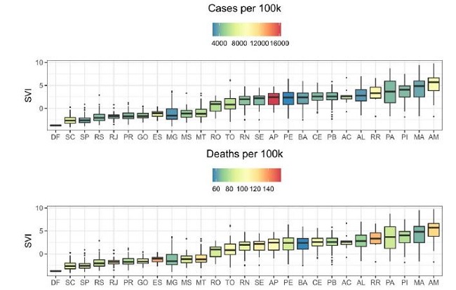 Although it is not the only affecting variable, SVI emerges as an alert, as it is an aggregated composition of variables expressing the social vulnerability of Brazilian states. States with a higher SVI tend to have more critical situations, due to the lack of urban basic sanitation and housing infrastructure, precarious public transport and, especially, the deficiencies in the public health system, which are essential elements to minimize the effects of the pandemic. The data set suggests taking local specificities and needs into account, as each region of the country has a different social reality.