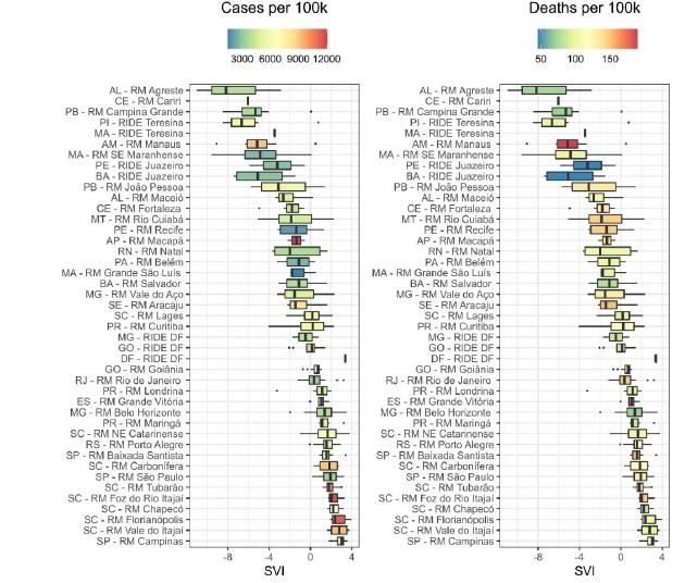 Although COVID-19 numbers have different explanations, which include cultural factors, social distancing, urban, road and airway mobility (DE PAULA et al., 2020), demographic density, among others, it is possible to indicate social vulnerability as one of the significant variables in this process. When comparing, for example, the MRs of Salvador, Fortaleza, and Recife, which have equivalent characteristics (the coastal capitals of the northeast, with similar population, international airport hubs, with urban characteristics, and similar road networks), it is clear that death due to COVID-19 is harsher in the MRs of Fortaleza and Recife, where the SVI is higher than in the MR of Salvador.