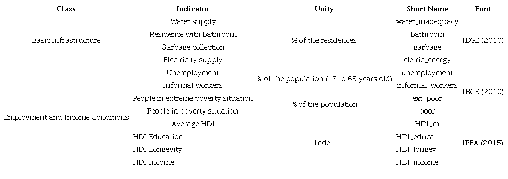 Indicators of economic, social and sanitation characteristics were calculated from variables obtained in the last demographic census (2010) conducted by the Instituto Brasileiro de Geografia e Estatística - IBGE (IBGE, 2010), and assembled by census sectors. IBGE data were also used to define the Regiões de Influência das Cidades - REGIC (REGIC, 2018). Data for infrastructure and health were obtained from the Ministry of Health database (DataSUS), and the selected variables were grouped at the municipality level (Table. 2).