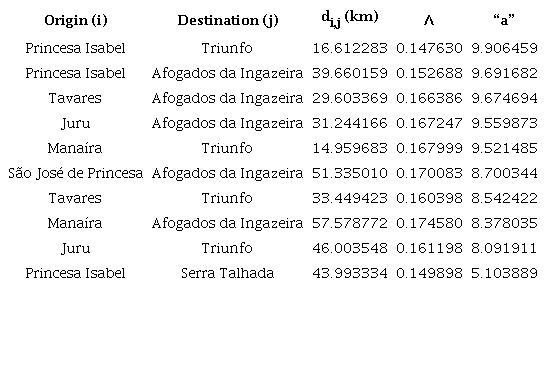 When analyzing the λ parameter, whose lower values imply a greater weight for the tourist flow, it is seen that the Princesa Isabel-Triunfo, Princesa Isabel-Serra Talhada, and Princesa Isabel-Afogados da Ingazeira interactions are the most likely for tourism. However, for non-tourism purposes (trade, search for medical services, and others), a spatial interaction constant between Princesa Isabel and Serra Talhada can be locally observed.