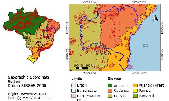 There are 239 conservation units (CUs) in the state of Bahia, according to data from Cadastro Nacional de Unidades de Conservação (CNUC), the national registry of conservation units, of the Ministério do Meio Ambiente (MMA, 2021), the main national environmental body and these CUs aim to conserve remnants of the Caatinga, Cerrado and Atlantic Forest biomes, which occur in the state (Figure 2).